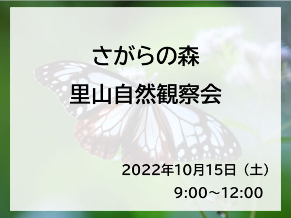 蒲郡の里山である「さがらの森」にて、講師を招き、里山の散策、動植物の観察、工作、渡りをする蝶「アサギマダラ」のマーキング等を実施します。 日時 2022年10月15日(土) 9:00~12:00(少雨決行) ※悪天候の場…