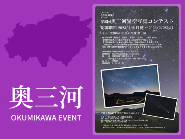 第6回奥三河星空写真コンテストの入賞作品展を行います。 奥三河地域(新城市、設楽町、東栄町、豊根村)で撮影された、 『星景写真(奥三河地域の風景を入れた星空の写真)』及び『天体写真(奥三河地域で撮影された天体の写真)』 …