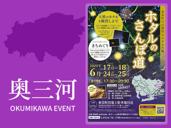 美しい川が流れる東栄町。 清流の川のせせらぎを聞きながら、晴れた日には満天の星の下で、まるで流れ星のような美しいホタルの光を見ることができます。 まちの雰囲気やお店に立ち寄りながらホタル観賞ができるイベントです。 期間中…