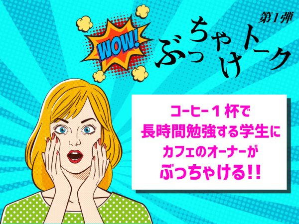 世の中には、沢山の本音と建前があり、そんな、ちょっと気になる業界の本音(ホンネ)を社会に出る前のピュアな学生が探っていく「ぶっちゃけトーク」を紹介したいと思います。今回は、コーヒー1杯で長時間勉強する学生に、カフェのオーナーがぶっちゃける。長時間いるのはいいの?悪いの?