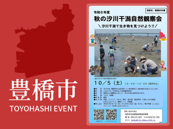豊橋市と田原市共同で、野鳥の観察や干潟の生き物の観察会を開催します。 イベント概要 日時 2024年10月5日(土) 10:00〜12:00 場所 汐川干潟(豊橋市杉山町) 申し込み 9月20日(金曜日)までに電子申請(…