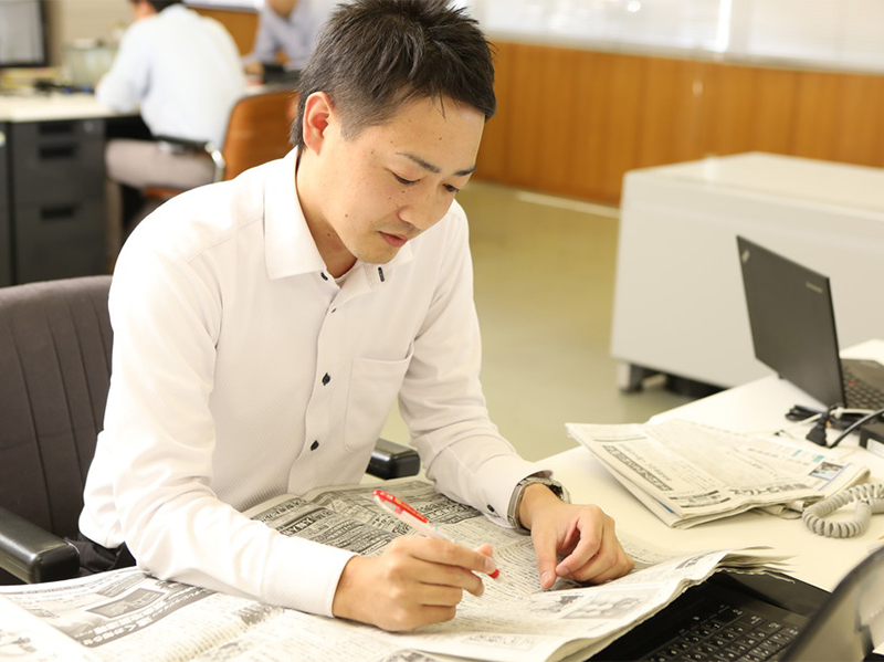 資材を調達するうえで、最先端の情報は不可欠です。購買課では、新聞や業界紙などから常に情報収集を行うのはもちろん、仕入先との密な情報交換、そして異業種交流会や展示会などにも積極的に参加しています。